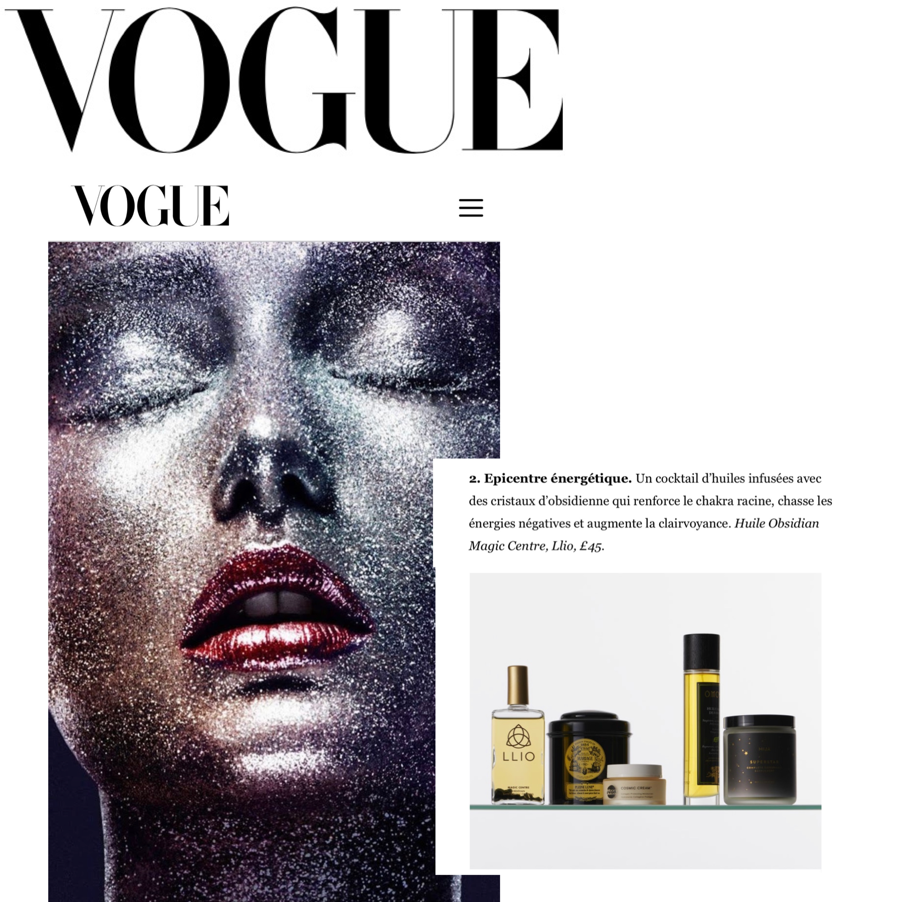 Then there was Vogue Paris who featured the Magic Centre Bath and Body Crystoil in the article ‘Head in The Stars’ a wellbeing feature. Vogue Paris is a romantic and elegantly created magazine (can you tell this is one of my favourite magazines yet?) that perfectly captured our brand and its luxurious aesthetic. This article focused on how to align the body and mind with the universe through skincare and beauty routines. They described the Magic Centre Bath and Body Oil as an ‘Energy Epicentre, a cocktail of oils infused with obsidian crystals that strengthen the root chakra, chase away negative energies and increase clairvoyance’. This product also includes vetiver- a luxury ingredient that enriches and nourishes the skin. The formula includes vanilla too which has an emotionally comforting scent and encourages relaxation. The obsidian crystals further enhance the effects of the essential oils, making this oil the perfect oil to ground your chakras and feel in control (blog post coming soon). LLIO has been featured twice in Vogue Paris, so if you didn’t get the chance to grab a copy you can find the most recent article at https://www.vogue.fr/beaute/article/comment-se-reconnecter-au-cosmos-univers