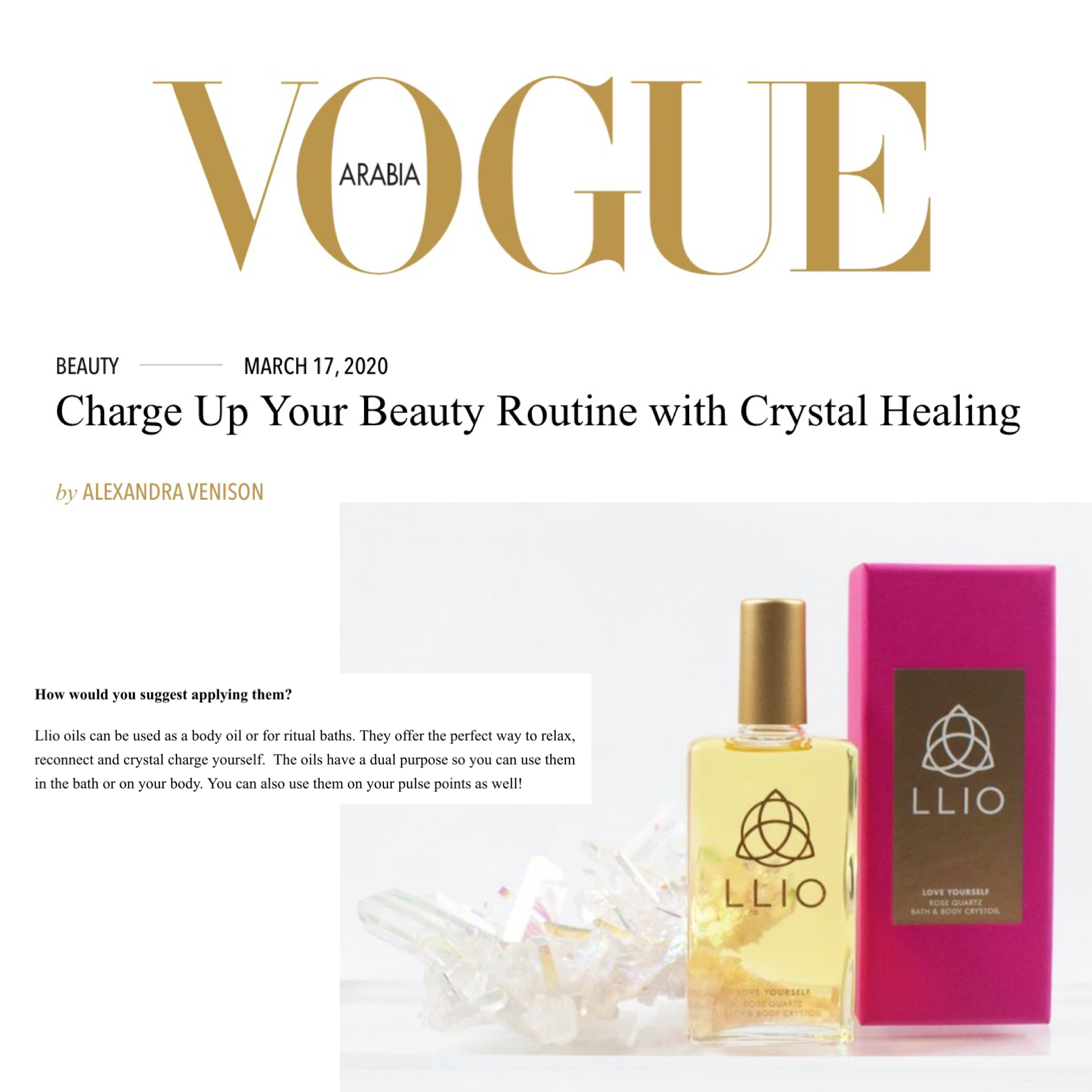 The Vogue Arabia feature came in March 2020 when we discovered they adore our Love Yourself Crystoil just as much as we do. The article “Charge Up Your Beauty Routine with Crystal Healing” explores how to switch up your beauty routine with crystal healing. Alexandra Venison (journalist) explains the importance of our product and how to use it, ‘the oils have a dual purpose; you can use them in the bath or on the body. You can also use them on your pulse points as well’. The products can be used pre-shower too! This was a great feature to be involved with as we offer worldwide shipping, this allowed the brand to connect with some of our customers from the Middle East. The only thing that the article didn’t mention is how enchanting the scent and ingredients truly are in this product, the mixture of orange, geranium and lavender scents combine for the perfect scent of indulgence. This is balanced too by the palmarosa, a magical ingredient that is perfectly hydrating and amazing at relieving stress.